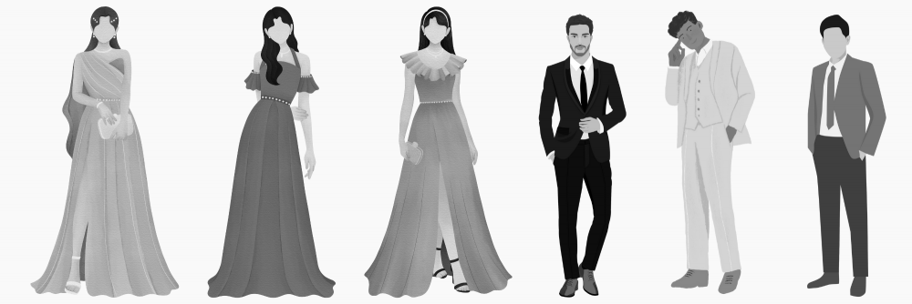Para elas: vestidos elegantes, podendo ser longos ou midi sofisticados, tons neutros, coloridos ou até mais glamourosos são super bem-vindos. A proposta é um visual chique, polido e atemporal.